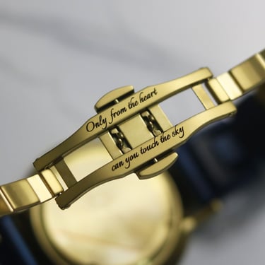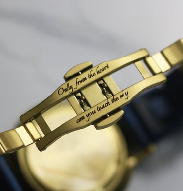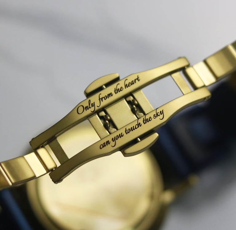The same 'Van-Gogh'esque design is expanded to the H+ Model strap and the clasp part. The goal was a coherently amalgamated look. On the clasp, the following is engraved (from Rumi):