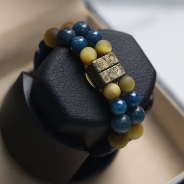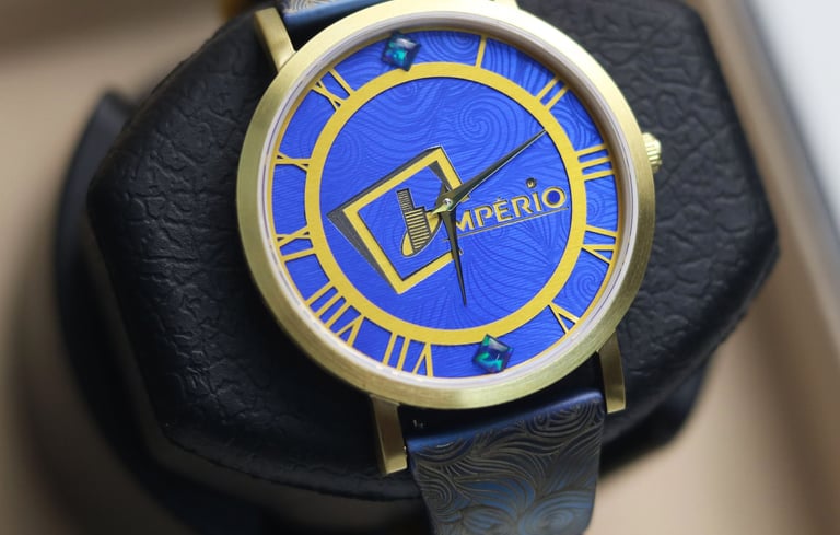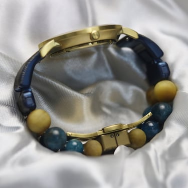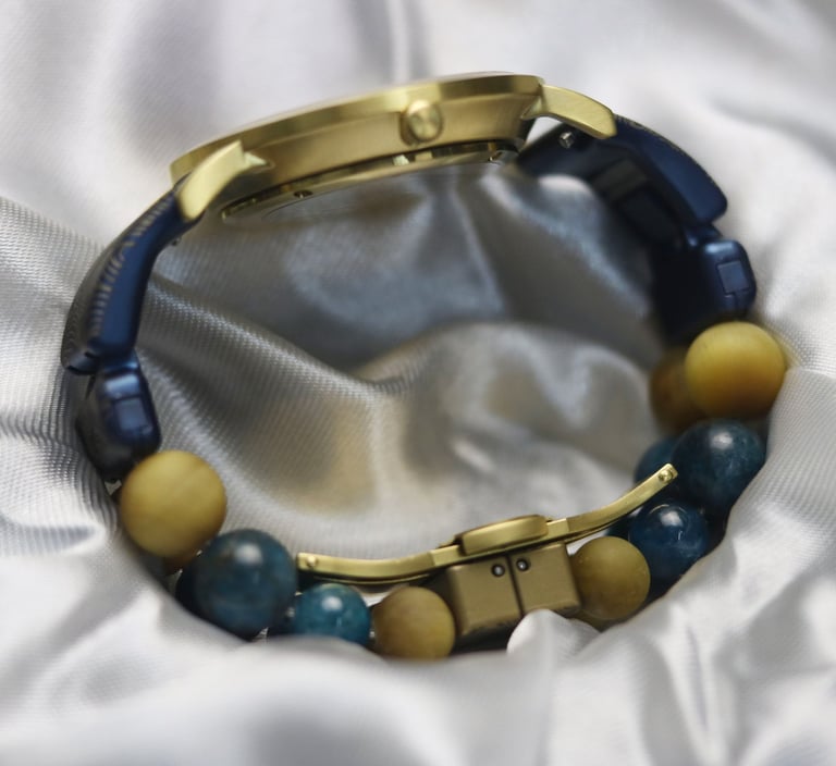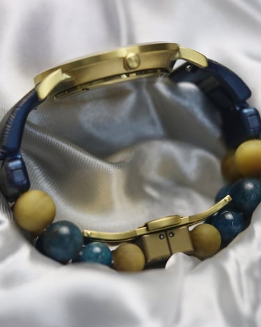 Matt Golden Tiger Eye and Apatite was the premium stones used in the assembly. And the watch was presented in a luxurious leather watch box with a rotating motor. Thus, the watch can be used as a table accessory when it's not on your wrist !