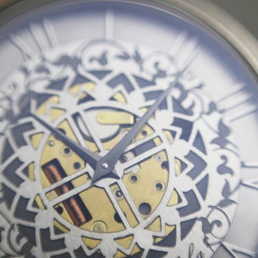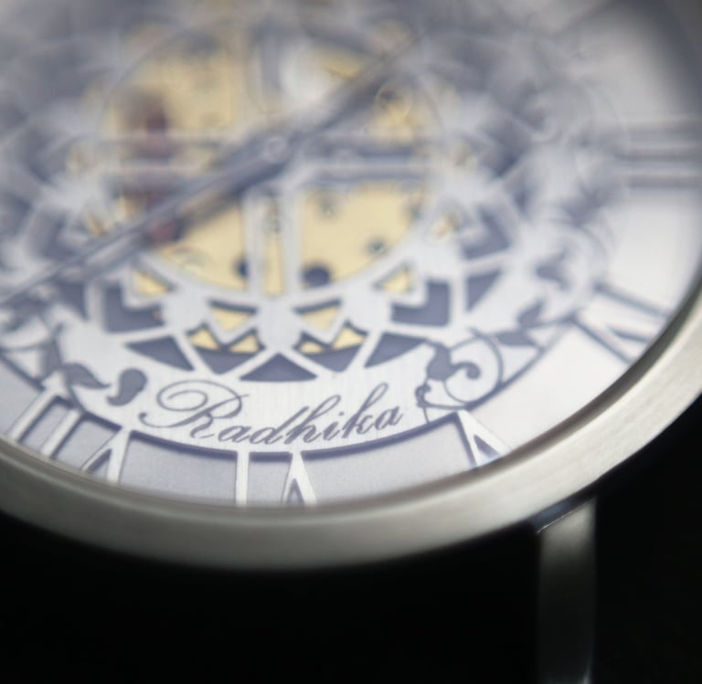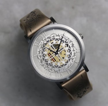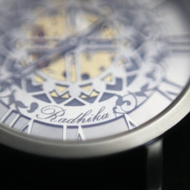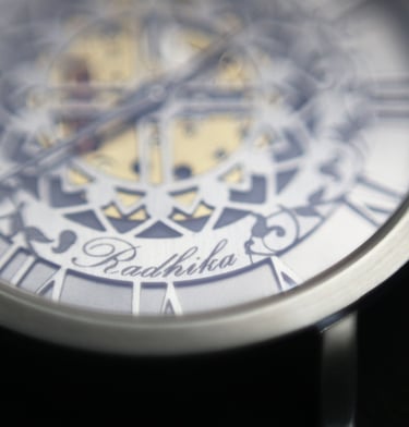 At the dial level, we used a skeletonized dial with Roman numerals. The movement is exposed and black hands are used. The circular engraving inside follows a Floral theme. The Black hands and Silver is pleasingly contrasted.
