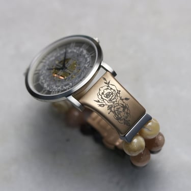At the strap level, we designed an engraving of a rose motif. There is an arrangement of roses on the clasp parts and three esoteric engravings motifs are added under the straps.