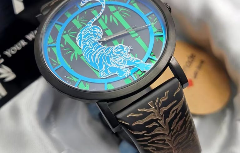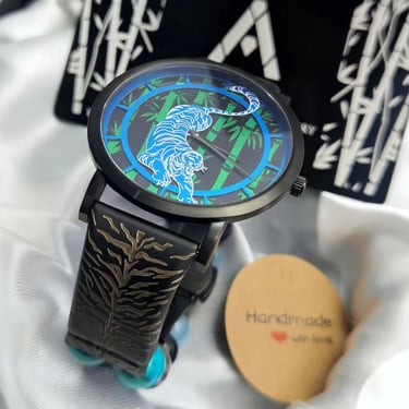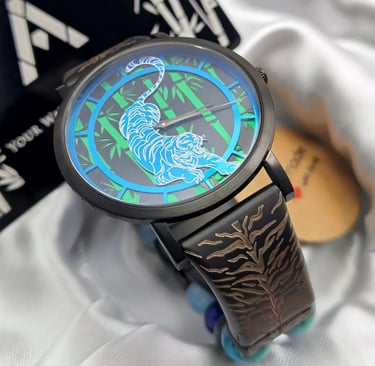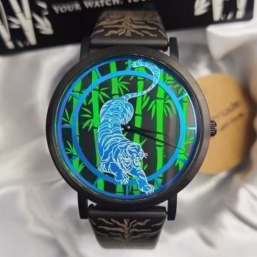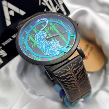 The dial consists of three levels, the blue plate is cut to outline the tiger and the hour marking followed by the tiger engraving. The blue plate is symbolic of freedom & she loves the color. The black plate serves as transition layer to create a background separating the blue and the green plate. The black plate is cut to create a bamboo motif. The lower green plate brings the color of life to the montage.