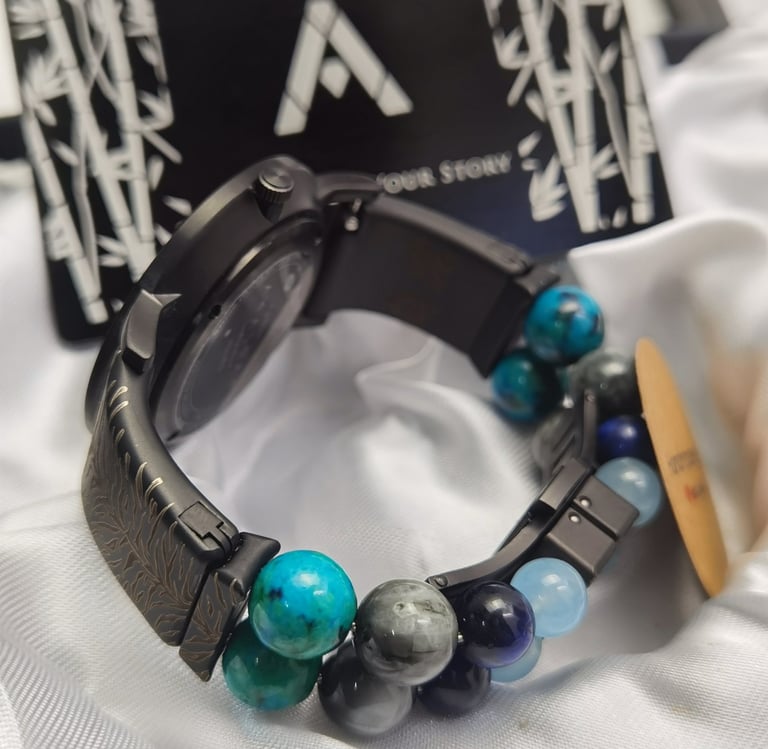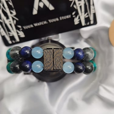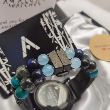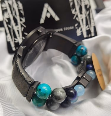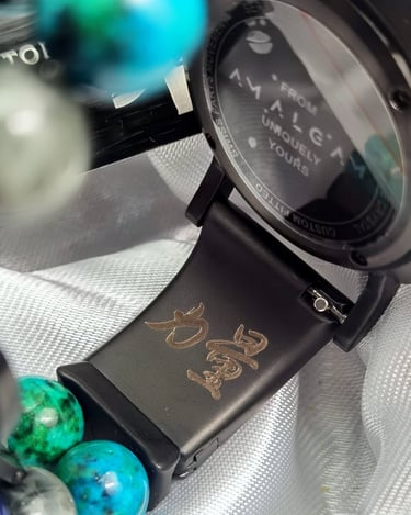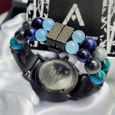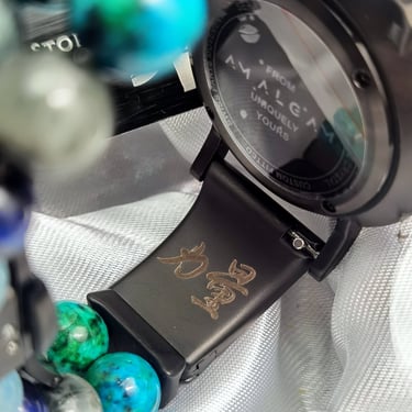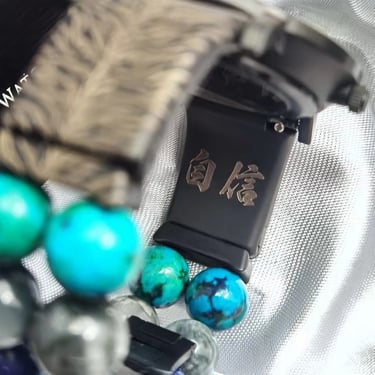 Underneath the straps, two Chinese characters are engraved pertaining to 'Strength' and 'Confidence' of the self. On her clasp, her date & time of birth in roman numerals are added. As for stones, we used Turquoise, Hawk Eye, Blue Tiger Eye and Aquamarine for a perfect fit with the dial.